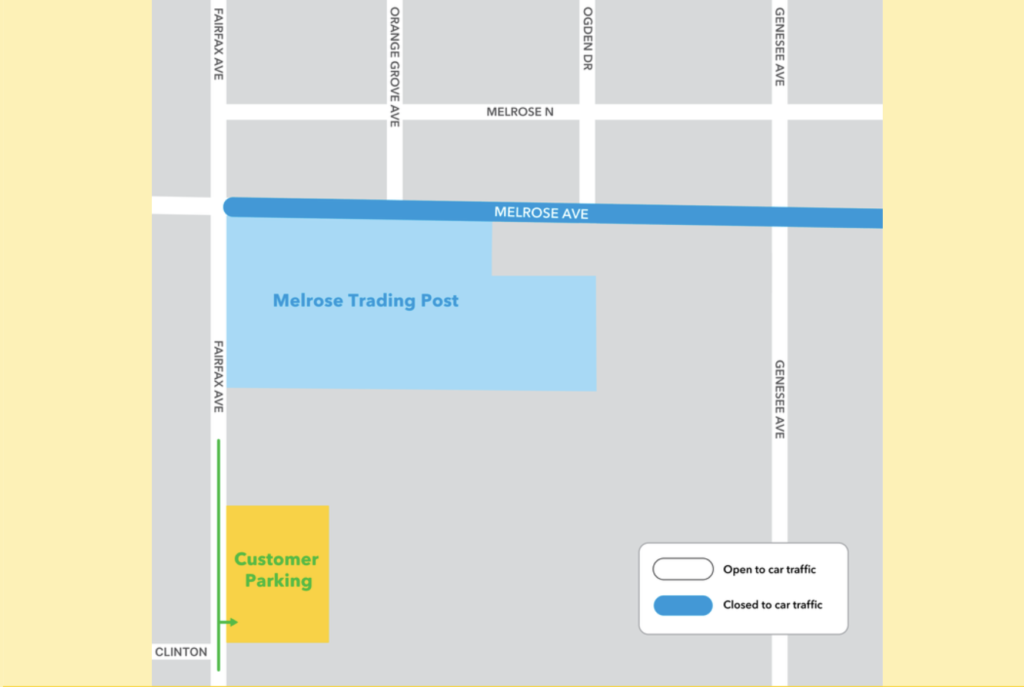 The Melrose Trading Post customer parking lot on Fairfax Avenue (south of Melrose) will remain accessible for the duration of the event.