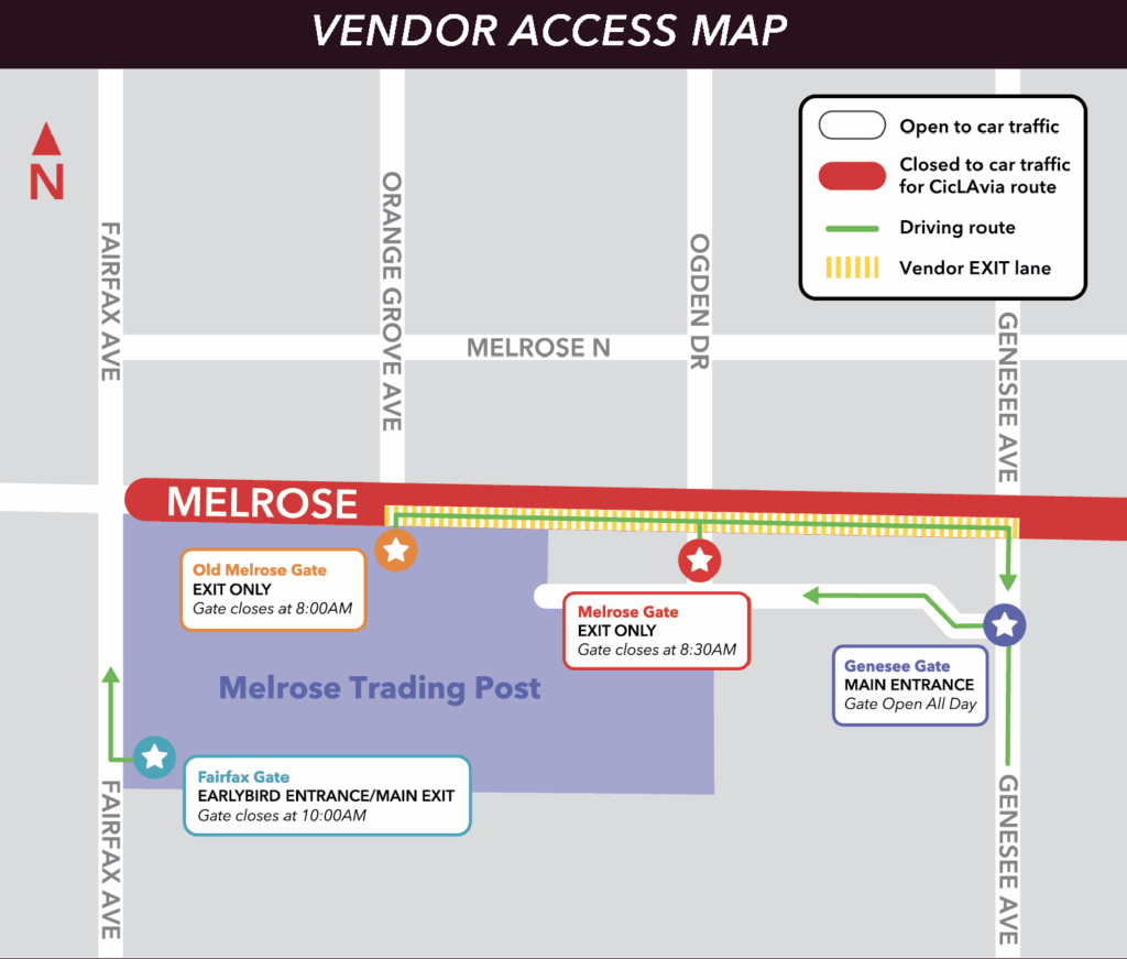 One lane of Melrose Ave will be open for Melrose Trading Post vendors to exit (turn right from the Melrose gates) for a limited period in the morning. See hours below.