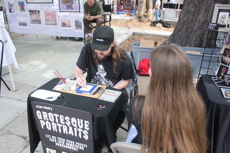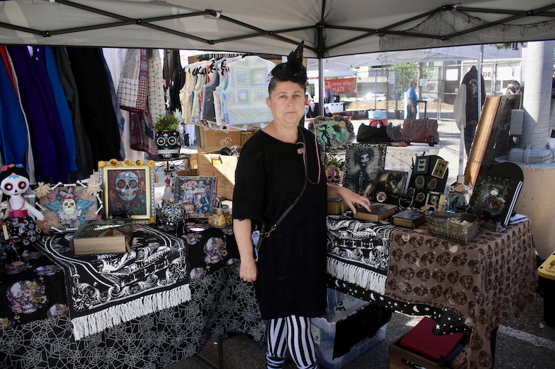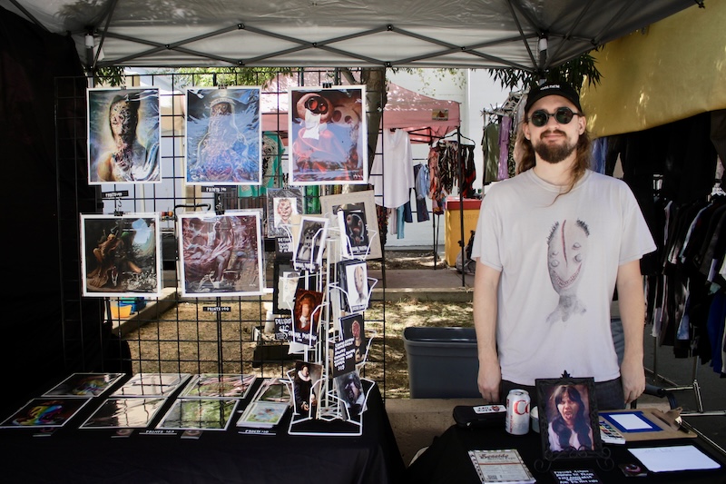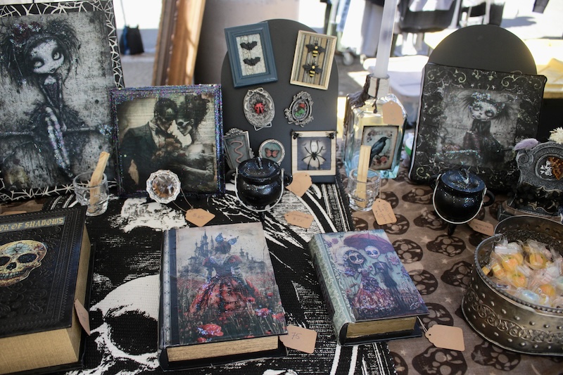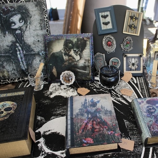Heather Staley is a newer vendor at MTP who creates divinely frightful designs. She prints her art onto a variety of mediums which feature motifs that evoke Dia De Los Muertos, Tim Burton movies, and gothic aesthetics.