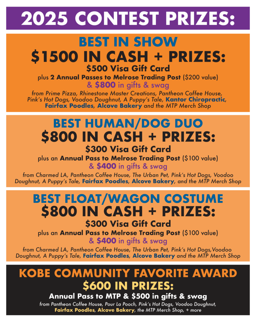 - Best Human/Dog Duo and Best Float/Wagon Costume will each receive a $300 Visa Gift Card plus $500 in gifts and swag, which includes an Annual Pass to MTP and a bundle of MTP merchandise as well as gifts from our sponsors Charmed LA, The Urban Pet, Pantheon Coffee House, Pink’s Hot Dogs, Voodoo Doughnut, A Puppy’s Tale, Fairfax Poodles, and Alcove Bakery!